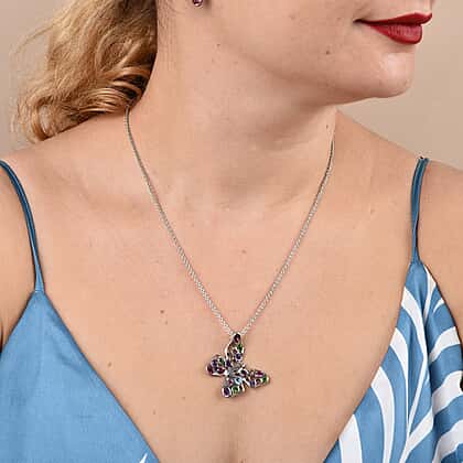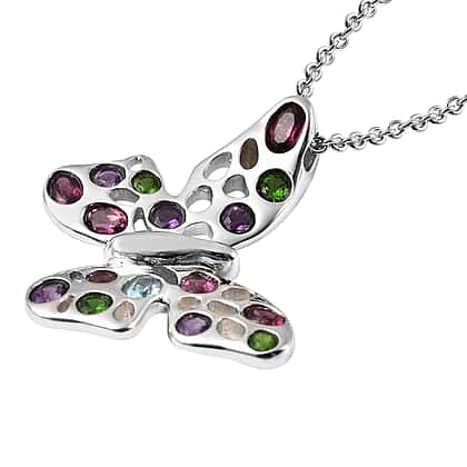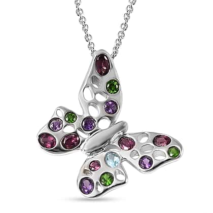 Rachel Galley Flutter (Butterflies) Collection - Rhodolite Garnet, Swiss Blue Topaz, Chrome Diopside and Amethyst Pendant with Chain (Size 20) in Rhodium Overlay Sterling Silver 2.50 ct.
