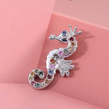 Rainbow Sapphire & White Zircon Sea Horse Pendant in Rhodium Overlay Sterling Silver