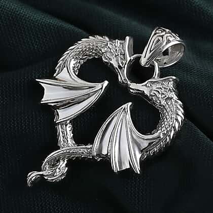 Unveil a striking dual-dragon design with this pendant from the Royal Bali Collection, where symmetry and intricate craftsmanship come together in a bold composition. Two finely detailed dragons curve inward, forming a heart-like silhouette, with their wings extended to create balance and movement. The sculpted scales, defined contours, and flowing tail elements add depth and texture across the form. Crafted in sterling silver, the polished finish enhances every carved detail, while the ornate bail complements the overall design. A distinctive piece that reflects strength, artistry, and a commanding visual presence.