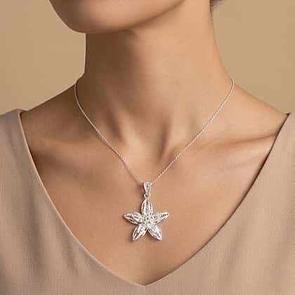 Define your look with this intricately crafted floral pendant, designed to capture attention through its detailed five-petal design. Each petal is shaped with fine openwork patterns, creating a lace-like texture that adds depth and dimension to the overall form. The layered detailing within the petals enhances the visual structure, allowing light to pass through and highlight the craftsmanship. A polished centre bead anchors the design, drawing the eye while maintaining balance across the piece. Crafted in 925 sterling silver, this offers lasting shine and durability. The symmetrical arrangement of petals gives it a refined and well-proportioned appearance, making it visually appealing from every angle. Finished with a smooth bail that connects seamlessly, the pendant offers a cohesive and thoughtfully constructed design. Its distinctive form makes it suitable for both everyday wear and occasion styling.