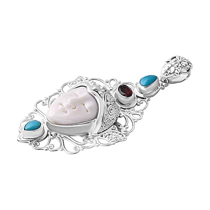Royal Bali Collection Ox Bone, Red Garnet & Sleeping Beauty Turquoise Goddess Pendant in Sterling Silver 7.91 Ct, Silver Wt. 9.80 Gms.