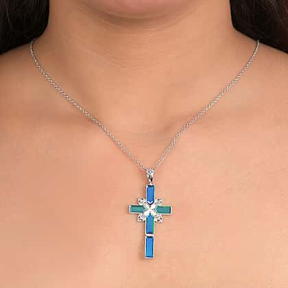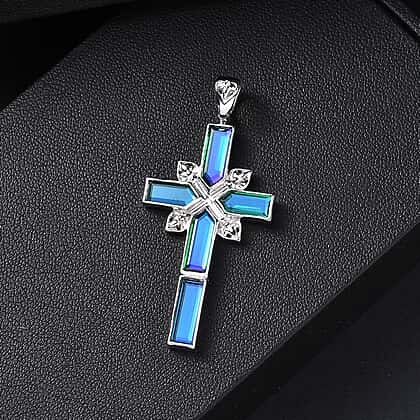 Sajen Silver - Peacock Triplet Quartz Cross Pendant in Rhodium Overlay Sterling Silver 3.49 Ct.