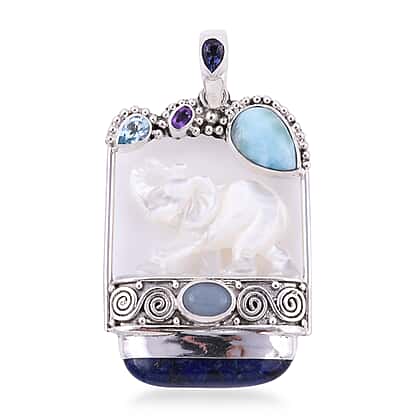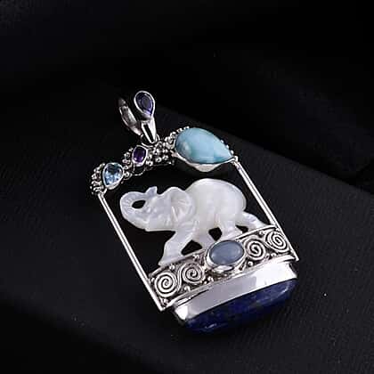 36.02 Ct. Sajen Silver Larimar, Lapis Lazuli and Multi Gemstone Carved Elephant Pendant in Sterling Silver