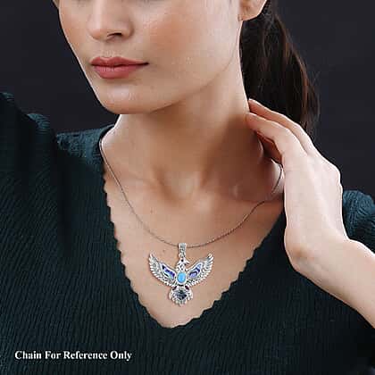 This pendant is a stunning piece of articulation in sterling silver. It showcases the natural beauty of a bird in flight and the diversity of gemstones. The pendant features a oval-shaped sleeping beauty turquoise, marquise-shaped fissure filled rubies, and fancy-shaped abalone shells, all set in sterling silver. The turquoise has a rich sky-blue hue, the fissure filled rubies have a deep red hue, and the abalone shell has a rainbow-like iridescence. The pendant is a perfect choice for any urban woman who appreciates the uniqueness of gemstones.