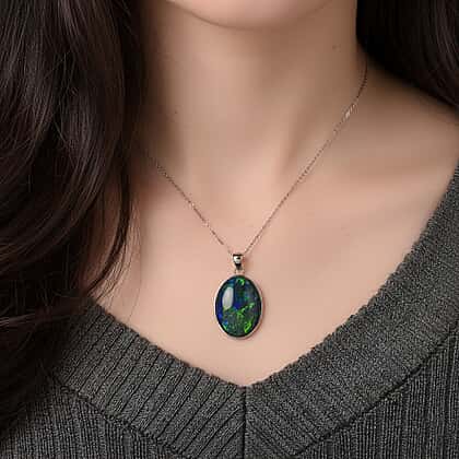 Glowing with stunning patterns and fire colours, this opal pendant can add a thoughtful edge and is perfect to finish off an upscale look. This boulder opal triplet reveals layers of deep blue and rainforest green that shift with every movement. The oval cut creates a smooth, uninterrupted surface, showcasing the stone’s natural flashes of colour, from ocean tones to cosmic sparks. Crafted in sleek platinum, the design is intentionally minimal, letting the opal’s pattern and play-of-colour take centre stage. This charm is attached with a clean bail and sits beautifully against the skin. Modern, mystical, and deeply individual, it’s a wearable work of art for those who love jewellery with soul.