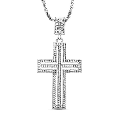 White Austrian Crystal Cross Pendant with Chain (Size 24) in Silver Tone