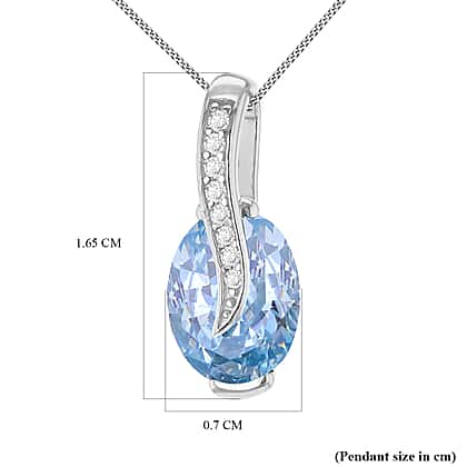 This pendant features a stunning 9x7mm light blue cubic zirconia oval solitaire, surrounded by eight exquisitely set white cubic zirconias on a designer shank. The cool tones of the blue and white stones evoke a sense of freshness and serenity, while the sterling silver setting enhances the pendant’s durability and provides a polished finish. This piece is perfect for those who seek a serene statement.