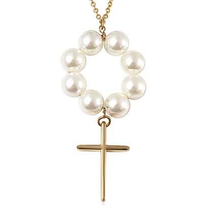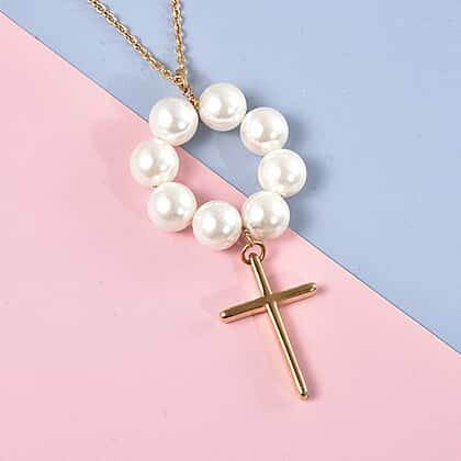 White Shell Pearl Cross Necklace Size 24 in Yellow Gold Tone