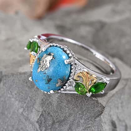 3 Carat Persian Turquoise, Diopside and Natural Cambodian Zircon Ring in Sterling Silver