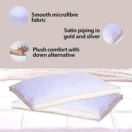 2 Piece Set- Superfine Microfibre Pillow Cases Filled with Faux Down and Finished with Satin Gold and Silver Piping 50x75 cm