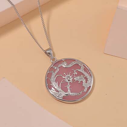 A Pink Jade centrepiece is fashioned with Dragon motifs crafted in Sterling Silver in this magical pendant presented in a glossy finish of Platinum and Rhodium Overlay. The pendant has a bold overview with the big-sized round jade sporting a blush pink colour.