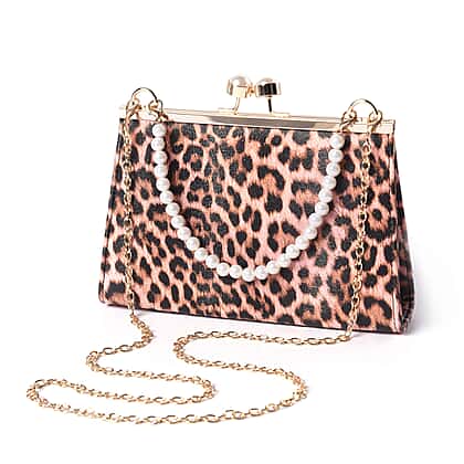 Pink Leopard Pattern Clutch Closure Crossbody Bag with Dangling Pearl Chain and Metallic Shoulder Strap in Gold Tone
