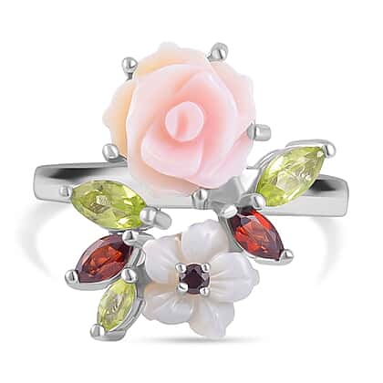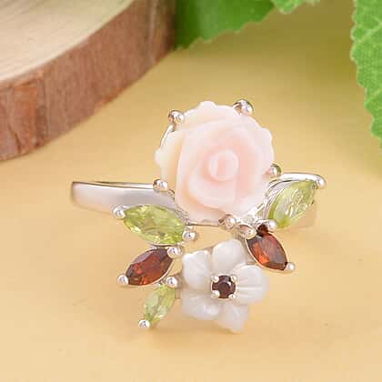 Pink Mother Of Pearl & Multi Gemstone Floral Ring in Rhodium Overlay Sterling Silver 4.58 Ct.