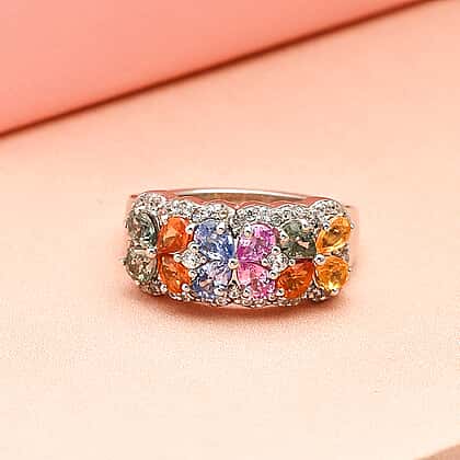 Find the springtime hues of colourful blooms gazing at you from this illuminating multi-gemstone cluster ring made in the finest quality silver. The ring features multi-colour sapphires that surprise you with a burst of pink, orange, yellow, blue and green hues. Natural zircons lend a bling effect to the ring. The cluster setting of the stones lights up in the regal touch of 18K yellow gold vermeil.