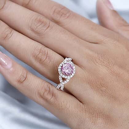 Pink & White Moissanite Halo Ring in 18K Rose Gold Vermeil Plated Sterling Silver 2.18 Ct.