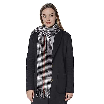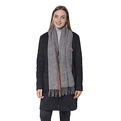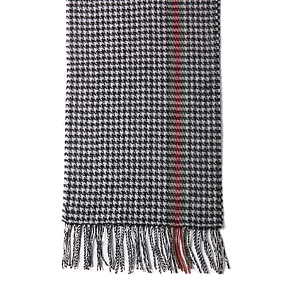 Houndstooth Pattern Wool Scarf with Fringes Black and Red