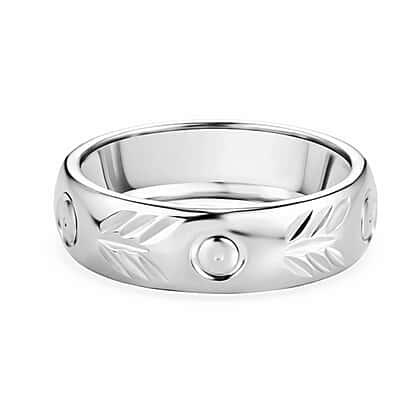 Add a refined touch to your look with this band ring, designed with a balance of texture and smooth detailing. The band features engraved leaf-inspired patterns that run across the surface, creating subtle depth and visual interest. Small circular accents are set evenly along the design, adding a modern contrast to the organic motif. Crafted in 925 sterling silver with platinum overlay, this band ring ensures lasting shine and luxurious appeal. The polished finish enhances its clean appearance, while the structured band offers a comfortable and secure fit. Combining decorative elements with a sleek form, this ring brings a distinctive yet wearable style to everyday and occasion looks.