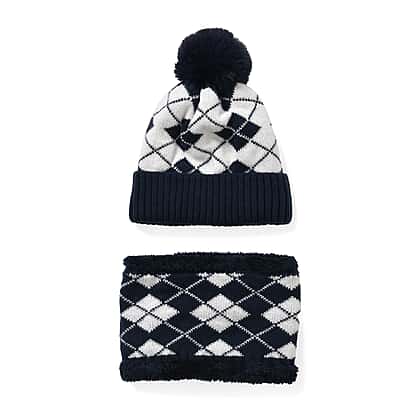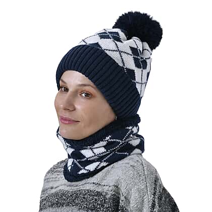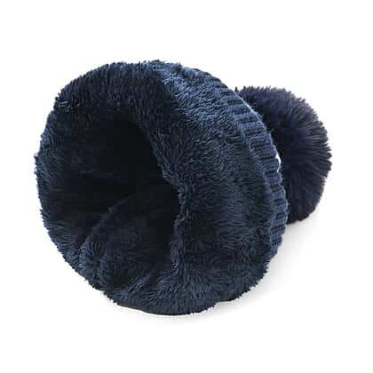 Plush Lined Pom Beanie Hat with Scarf Set - Navy