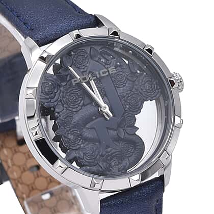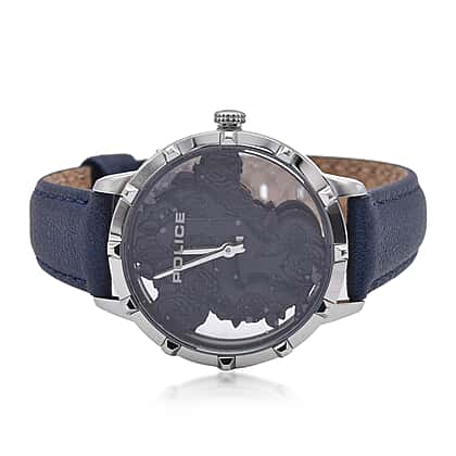 Police MARIETAS Watch with Navy Leather Strap, Silver Case and Blue Dial