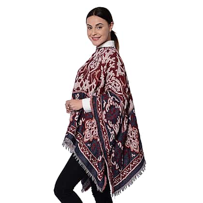 Bohemian Style Poncho with Jacquard Pattern in Burgundy (140x65cm)