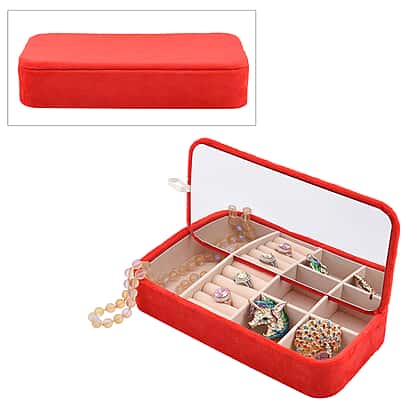Portable Velvet Jewellery Box with Inside Mirror and Anti Tarnish Lining (Size 25x12x5 Cm) - Red Colour
