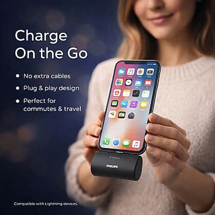 The Philips Powerbank is the perfect companion for iOS users on the move. Designed with a sleek, ultra-small profile, it's ideal for those who prefer not to carry a bulky power bank. Its unique plug-and-play feature, with an integrated lightning connector, means no extra cables are needed – simply attach it directly to your iOS devices for instant charging. This power bank seamlessly integrates into your device, providing a streamlined, efficient charging experience without the clutter.