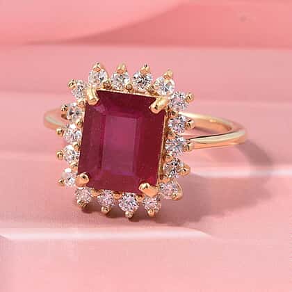 Premier African Ruby (4.5 Ct.) & Lab Grown Diamond SI-GH (0.60 Ct.) Emerald Cut Halo Ring in 18K Vermeil Yellow Gold Plated Sterling Silver 5.20 Ct.