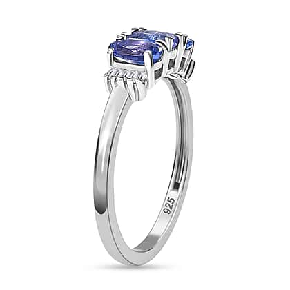 Tanzanite, White Diamond 3 Stone Ring in Rhodium Overlay Sterling Silver