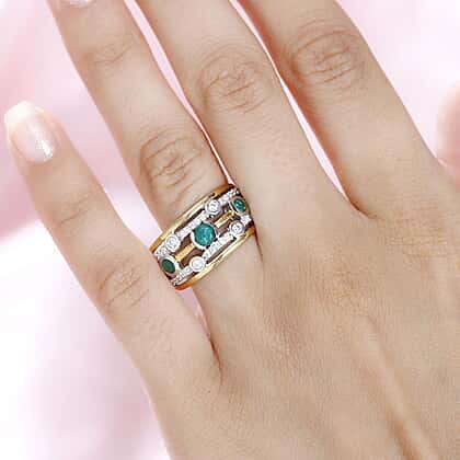Premium Emerald & Moissanite Bubble Multi Row Ring in 18K Vermeil Yellow Gold Plated & Platinum Overlay Sterling Silver 0.96 Ct.
