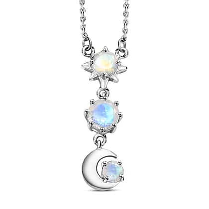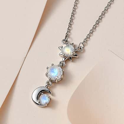 There are several healing stones and moon glow stone is believed to be associated with the power of protection and harmony. It shields against negative energies, promoting emotional healing and spiritual connection with the universe. The platinum overlay silver setting lends elegance to the celestial theme. The matinee-length chain is versatile and makes the necklace ready to wear.