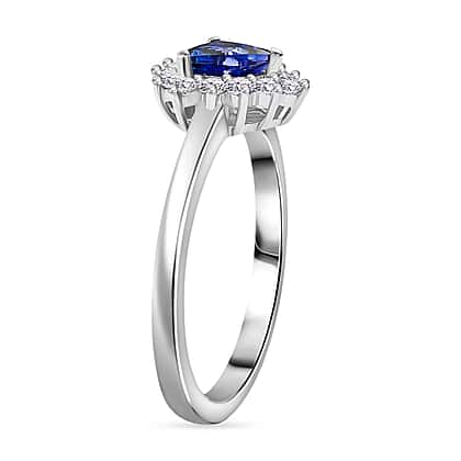 Tanzanite, White Zircon Halo Ring in Rhodium Overlay Sterling Silver