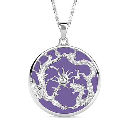 Traditional enterprise in silver work meets the exotic charm of Purple Jade, in this mesmerising Pendant. The round frame of the pendant is iliad with a polished jade cabochon dispersing purple hues. The jade stone becomes the perfect backdrop to the dragon art on silver that take centre stage in the pendant draped in Platinum and Rhodium Overlay