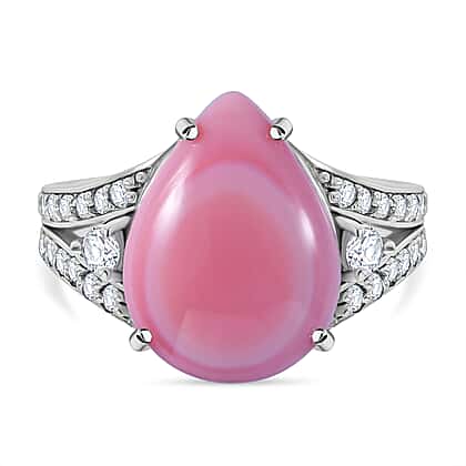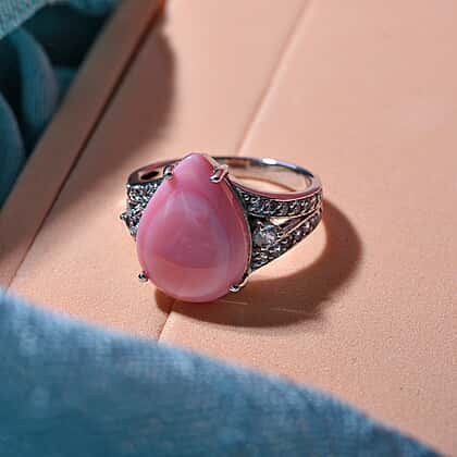 The pastel-perfect portrait of this pink conch shell ring bathed in the brilliance of natural white zircons makes it a coveted ornament, one desired by the connoisseurs of natural and rare gemstones. The ring has a vintage appeal accented by the richly decorated shank paved with glittering zircons. The conch shell is rooted in belief systems, which position it as a symbol of purity, new beginnings, and positive energy.