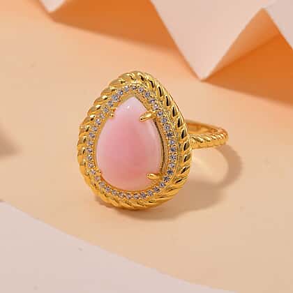 Add a touch of elegance to your jewellery collection with this stunning pink conch shell ring. This piece radiates sophistication and charm, featuring a bold pear-shaped pink conch shell. Encircled by a halo of round-shaped white zircon stones, the central gemstone stands out, drawing attention to its unique beauty. The ring is further enhanced by a rope-textured border around the head and a matching band, adding a layer of intricate detail that sets it apart. Crafted in luxurious 18K yellow gold vermeil plated sterling silver, this ring is not only a statement piece but also a timeless addition to any wardrobe.