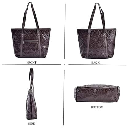 Quilted Pattern Genuine Leather Tote Bag - Brown