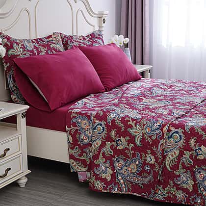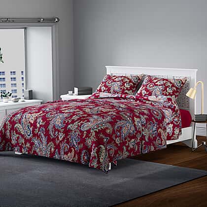 3 Piece Set - Microfiber Paisley Floral Printed Quilt and 2 Pillow Case - Burgundy and Multi