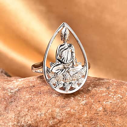 - DESCRIPTION: Carry wisdom and enlightment with you through this Buddha Ring in shimmer of Rhodium plated sterling silver
