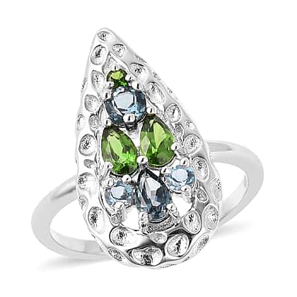 - To add some soothing freshness to the ring, London Blue Topaz stones are complemented with two pear-cut and a round-cut Chrome Diopside of 0.520 ct.