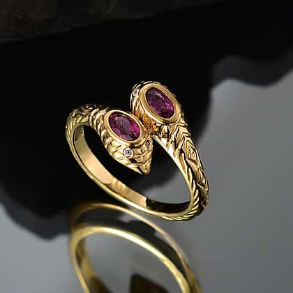 Inspired by ancient symbolism, this radiant Ember garnet serpentine bypass ring embodies transformation, strength, and elegance in equal measure. Two rich, oval garnets sit poised like twin serpent heads, their vivid purple-red tones glowing with natural fire and allure. Sparkling white zircons highlight their gaze, bringing a touch of light against the deep stones. Crafted in vermeil yellow gold over sterling silver, the band showcases intricate serpentine engravings that twist with fluid grace. With its hypoallergenic, tarnish-resistant finish and gemstones prized for durability and sparkle, this captivating design is both a statement of power and everyday sophistication.