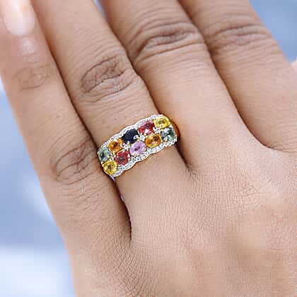 Rainbow Sapphire and Natural Zircon Cluster Ring in 18K Vermeil Yellow Gold Plated Sterling Silver 2.40 Ct.