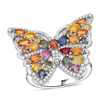 Bask in nature's beauty with this butterfly-inspired ring, featuring a rainbow sapphire that radiates luxury and charm. Sapphires are carefully arranged to create a striking butterfly motif, symbolising freedom and new beginnings. Adorned with dazzling white zircons outlining the butterfly design, it catches light from different angles. Crafted in hypoallergenic 925 sterling silver, this ring offers durability and comfort to sensitive skin. The glossy rhodium overlay provides a mirror-like shine and a polished finish. Get ready to glam every evening with this stunning butterfly-inspired ring.