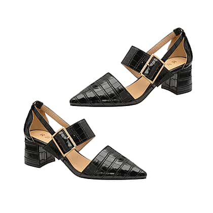 - Shoes feature low block heels
