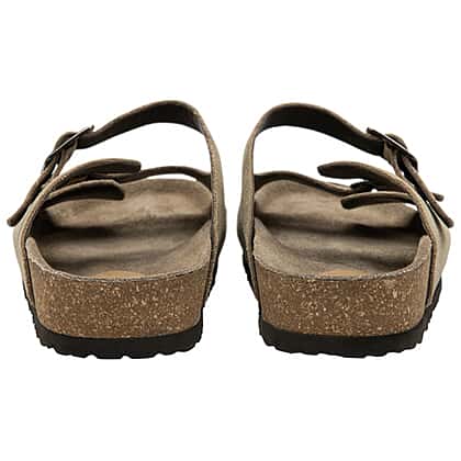 - Double straps finished with an adjustable buckle fastening make up the leather upper of this almost flat