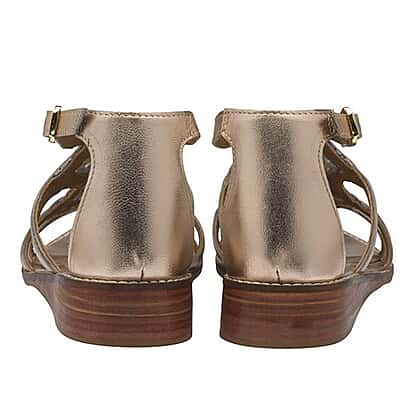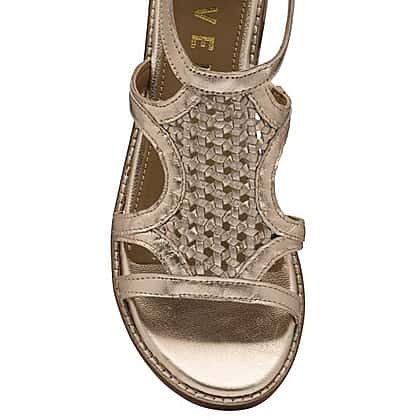 - Cut-out side straps and woven detailing on the front offer a graceful look to the sandals