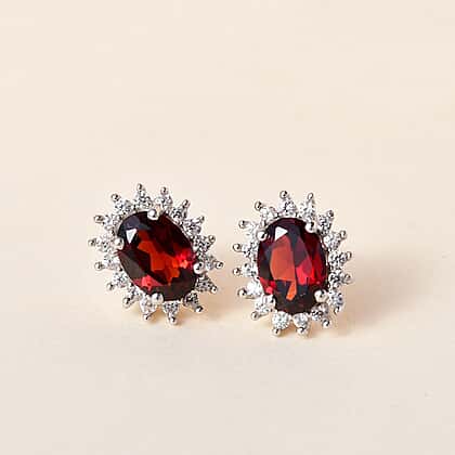 Red Garnet January Birthstone Halo Stud Earrings with Cambodian Zircon in Platinum Plated Sterling Silver