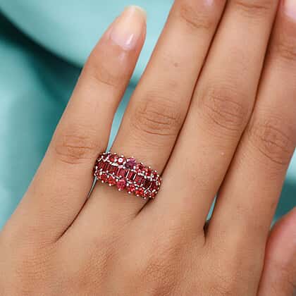 - GEMSTONE CUT AND CARAT: The ring features round and baguette cut red sapphire aligned in three rows atop the band in a cluster of 2.310 ct.