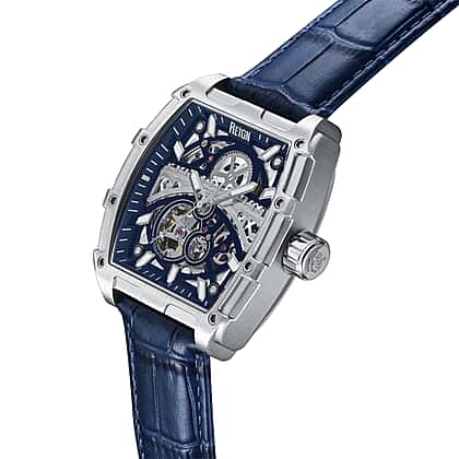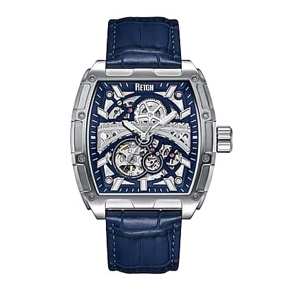 REIGN OLYMPIA Automatic Movt. 10 ATM Water Resistant Watch with Blue Genuine Leather Strap in Silver Tone