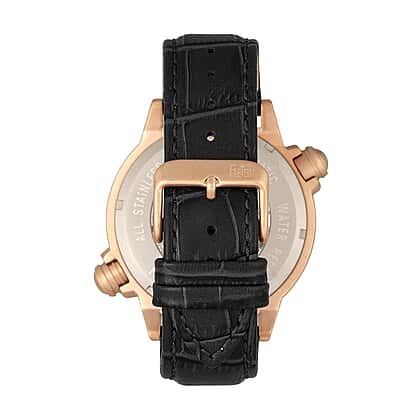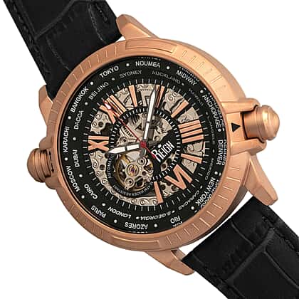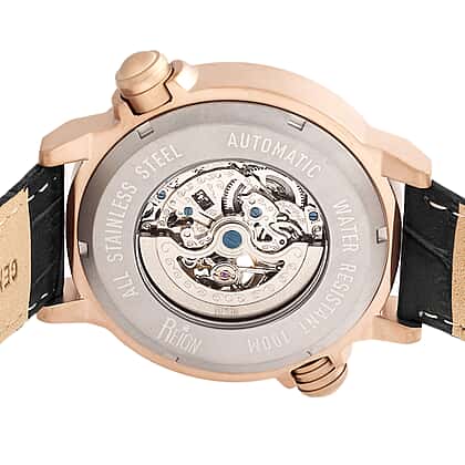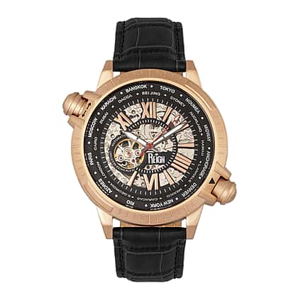 Reign Thanos Automatic Movement Skeleton Dial Water Resistant Watch with Stainless Steel Case and Genuine Leather Strap - Rose Gold & Black