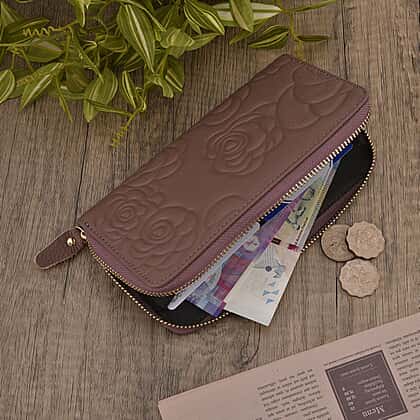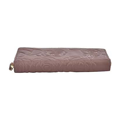 - This wallet features floral embossed design on the outer