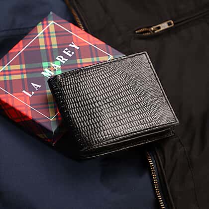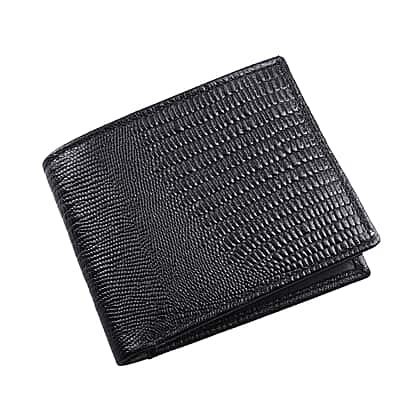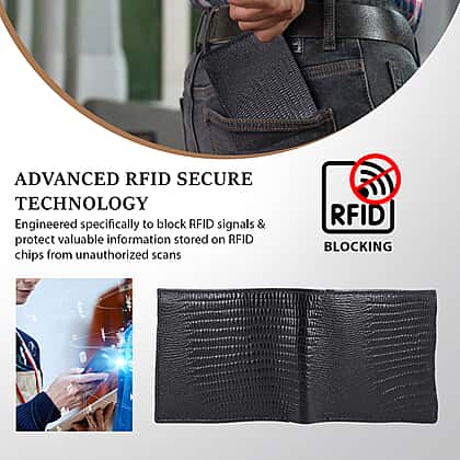 Genuine Leather Lizard Embossed Bi Fold Mens Wallet (RFID Protected) - Black